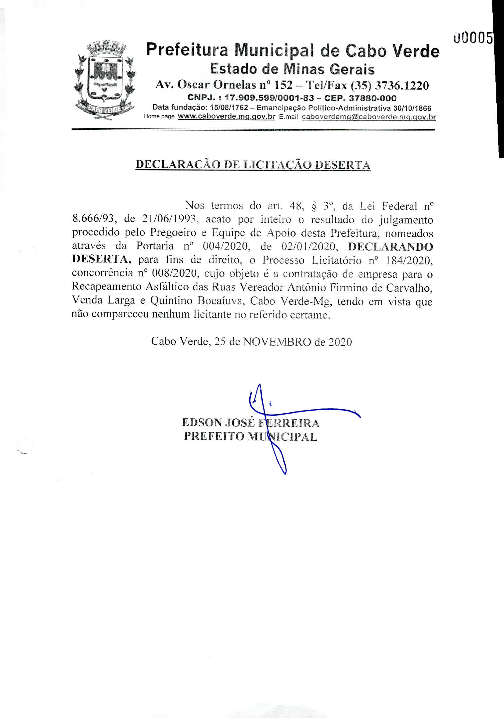 EDITAL 184/2020 CONTRATAÇÃO DE EMPRESA PARA O RECAPEAMENTO ASFÁLTICO DAS RUAS V (Arquivo PDF)